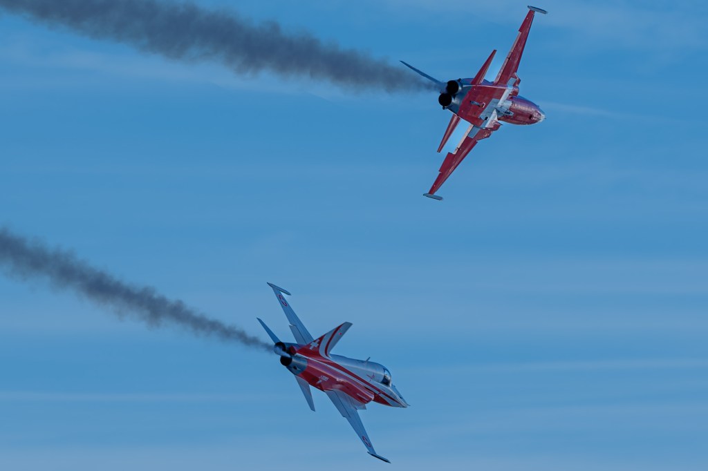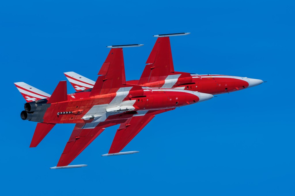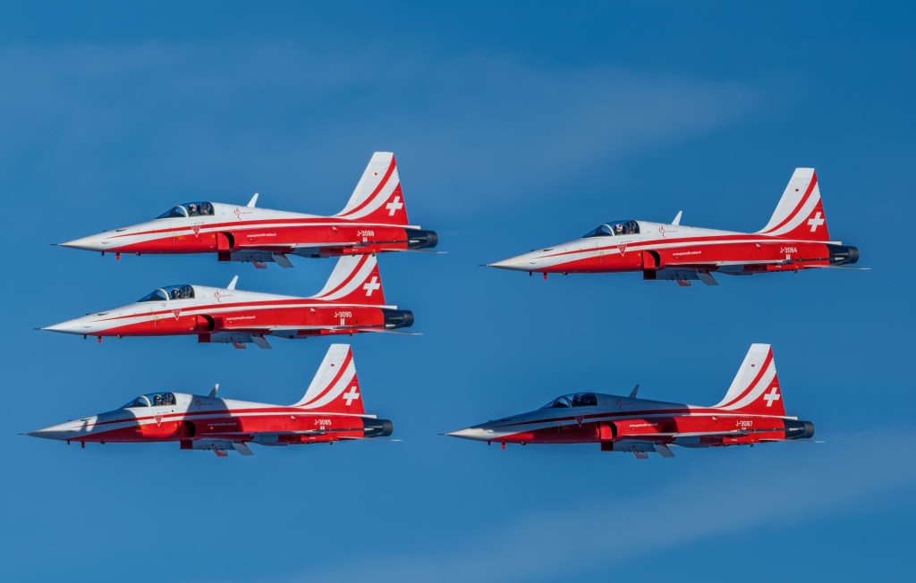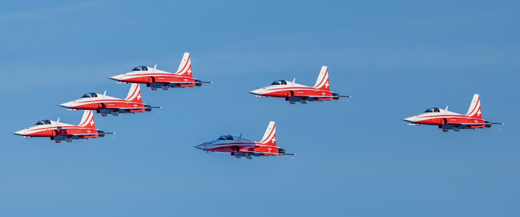 Mit wenig Leistung, und daher langsam und leise flogen die Northrop F-5E Tiger in enger Formation direkt vor meinem Standort vorbei. Ein ergreifender Moment…