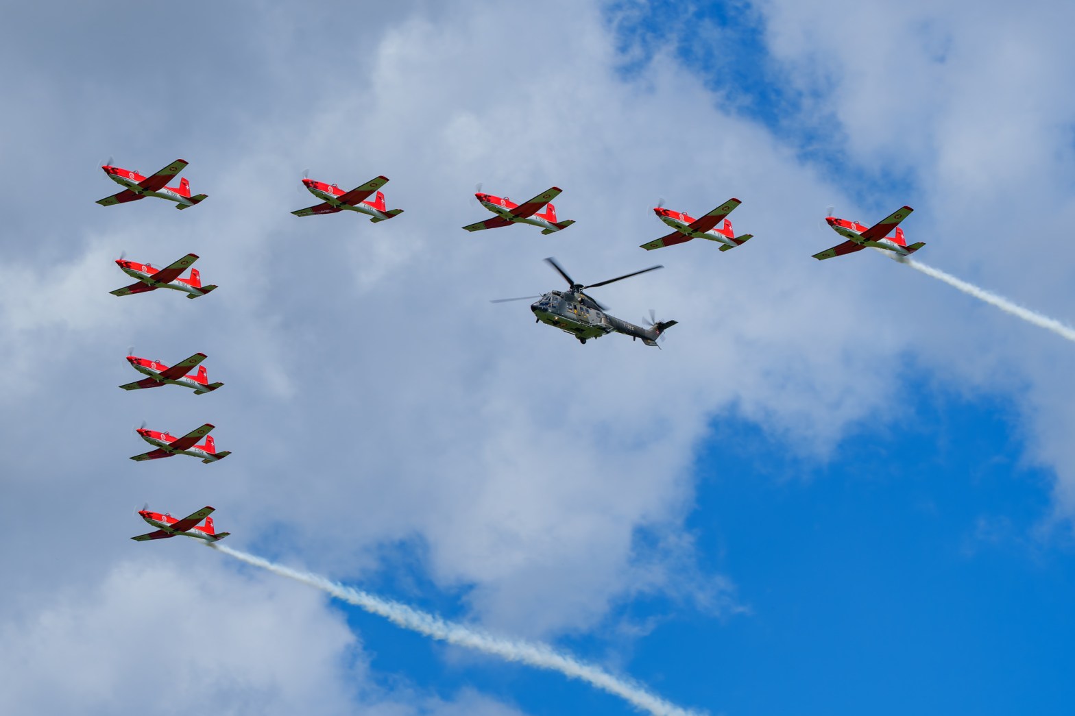 Am 24. April 2025 zeigte sich das PC-7 Team in Grenchen zu einem frühmorgendlichen Training. Das Wetter war an diesem Vormittag doch noch sehr bewölkt mit einer Wolkenuntergrenze unter 1000 Meter.